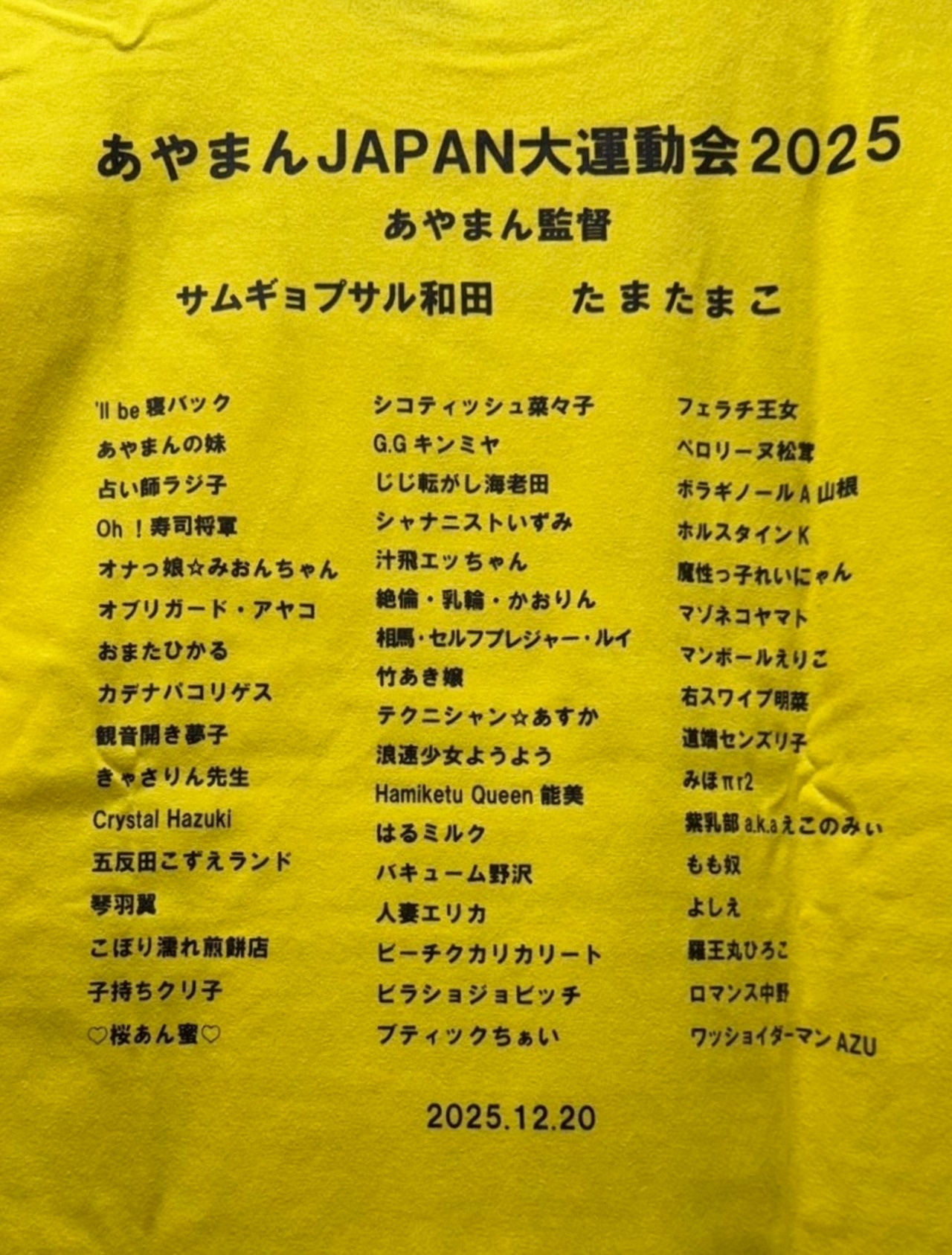 あやまん大運動会2025に向けて特別にデザインされた「あやまんJAPAN大運動会2025たまこチームTシャツ」です!前面にはたまこチームのシンボルが大きくプリントされており、チームの絆を感じさせるデザインとなっています☆彡